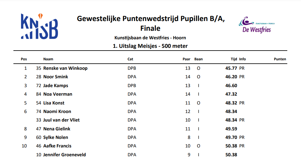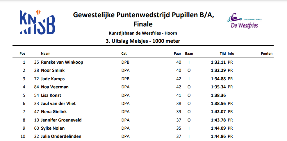 Door zich alsmaar te verbeteren komen onze toppers hoog in de Vantage ranglijsten en worden ze genodigd voor deze gewestelijke punten wedstrijden. Onder begeleiding van trainer/coach Elwin van den Beld wisten de meiden een 4-tal geweldige PR's te rijden (op de 500 en de 1.000 meter) en veroverde daarmee in de dag uitslag beide plek 1 en 2 op deze afstanden. Met name op de 1.000 meter staken ze met kop en schouders uit boven de rest van de deelnemers.